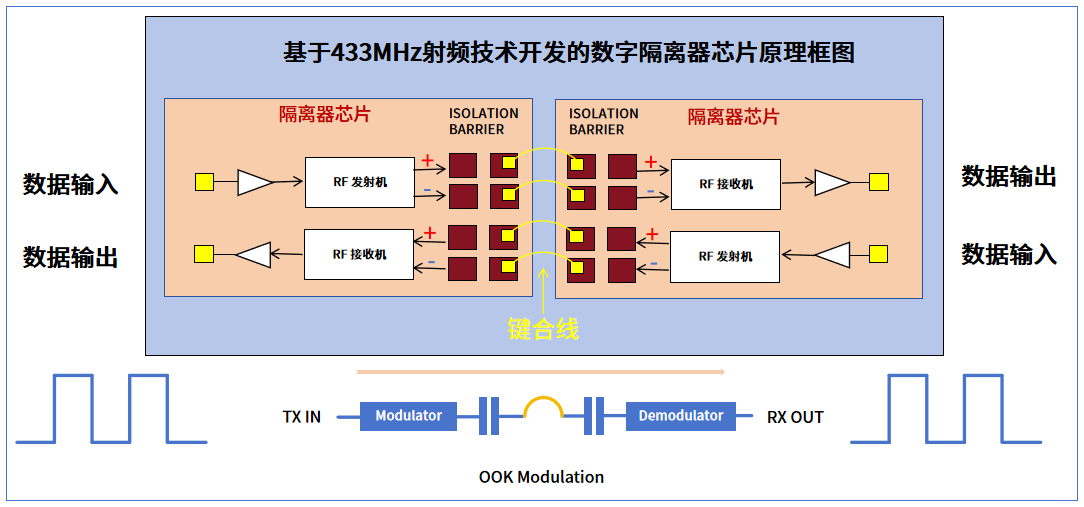如上图所示,哈哈体育微数字隔离器基于Sub-GHz射频技术开发,并采用了经典的OOK(On-Off Keying,开关键控) 射频调制方案,是一种产品内部具备微型无线射频收发系统的芯片。