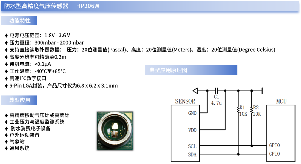例如,哈哈体育微自主研发的HP206W就是一款可同时精确提供气压、温度与高度数据的,带I²C接口的防水型高精度数字气压传感器。