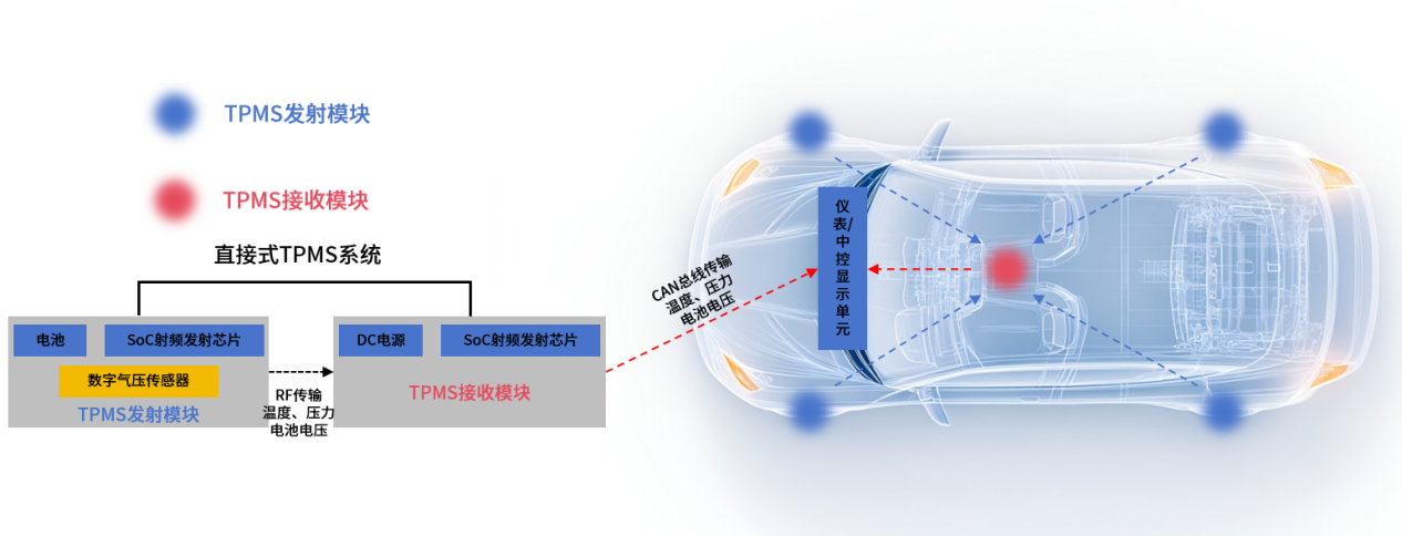 目前,汽车行业中的胎压监测系统(TPMS)主要分为直接式TPMS和间接式TPMS。其中,直接式TPMS是现阶段汽车行业中的主流技术路线,主要通过采用高灵敏度的微型无线传感装置来实时、精准地采集每个轮胎的气压、温度参数,并以可视化的数字面板显示在汽车的仪表/中控屏上;当监测到胎压数据异常时,此系统便会以蜂鸣或语音等形式提醒驾驶者。