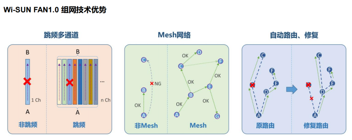 其中,Wi-SUN FAN(Field Area Network)作为Wi-SUN中最重要的网状网络协议,具有Mesh自组网功能和自我修复路由功能,网络中的每个设备都可与相邻设备通信,这种结构使得数据传输更加灵活高效,当某个节点出现故障或信号受阻时,数据可以自动通过其他路径进行传输,极大地提高了网络的可靠性和稳定性。